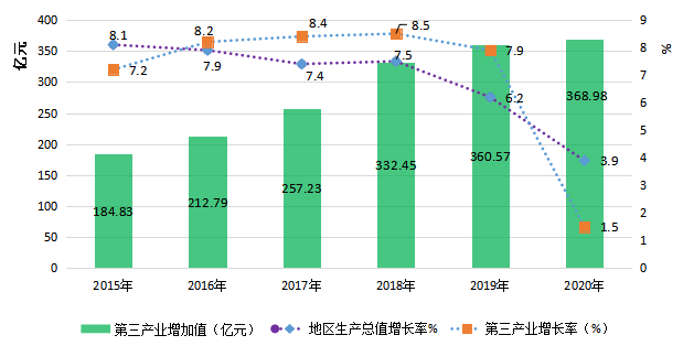 “十三五”期间,全市服务业总体规模不断扩大。服务业增加值总量由2015年的184.83亿元增加到2020年的368.98亿元,实现了翻番;发展速度稳中有升,年均增长6.9%;服务业占地区生产总值比重逐年提高,由2015年的25.9%上升到2020年的36.0%,提高了10.1个百分点,服务业已成为全市经济社会稳步发展的重要支撑。