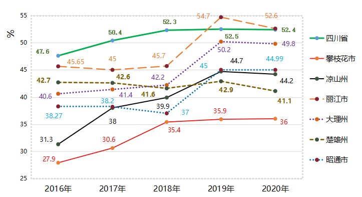从各县(区)服务业发展规模来看,五年来,东区总体规模继续保持第一,占全市服务业增加值比重53%左右,仁和区第二,米易县第三,盐边县第四,西区第五;从发展速度来看,米易县发展速度较快,平均增速保持第一,东区第二,仁和区第三,盐边县第四,西区第五,各县(区)发展势头强劲,平均增速基本保持在6%以上。