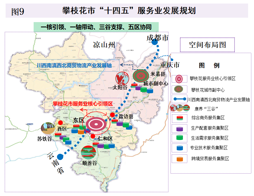 8.“一核一带三谷”。一核:以东区为主的阳光康养产业发展核心区;一带:以盐边县为主的阳光康养运动旅游生态带;三谷:西区“苏铁谷”、仁和区“颐养谷”、米易县“太阳谷”。