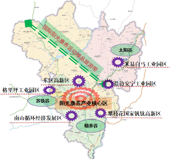 8.“一核一带三谷”。一核:以东区为主的阳光康养产业发展核心区;一带:以盐边县为主的阳光康养运动旅游生态带;三谷:西区“苏铁谷”、仁和区“颐养谷”、米易县“太阳谷”。